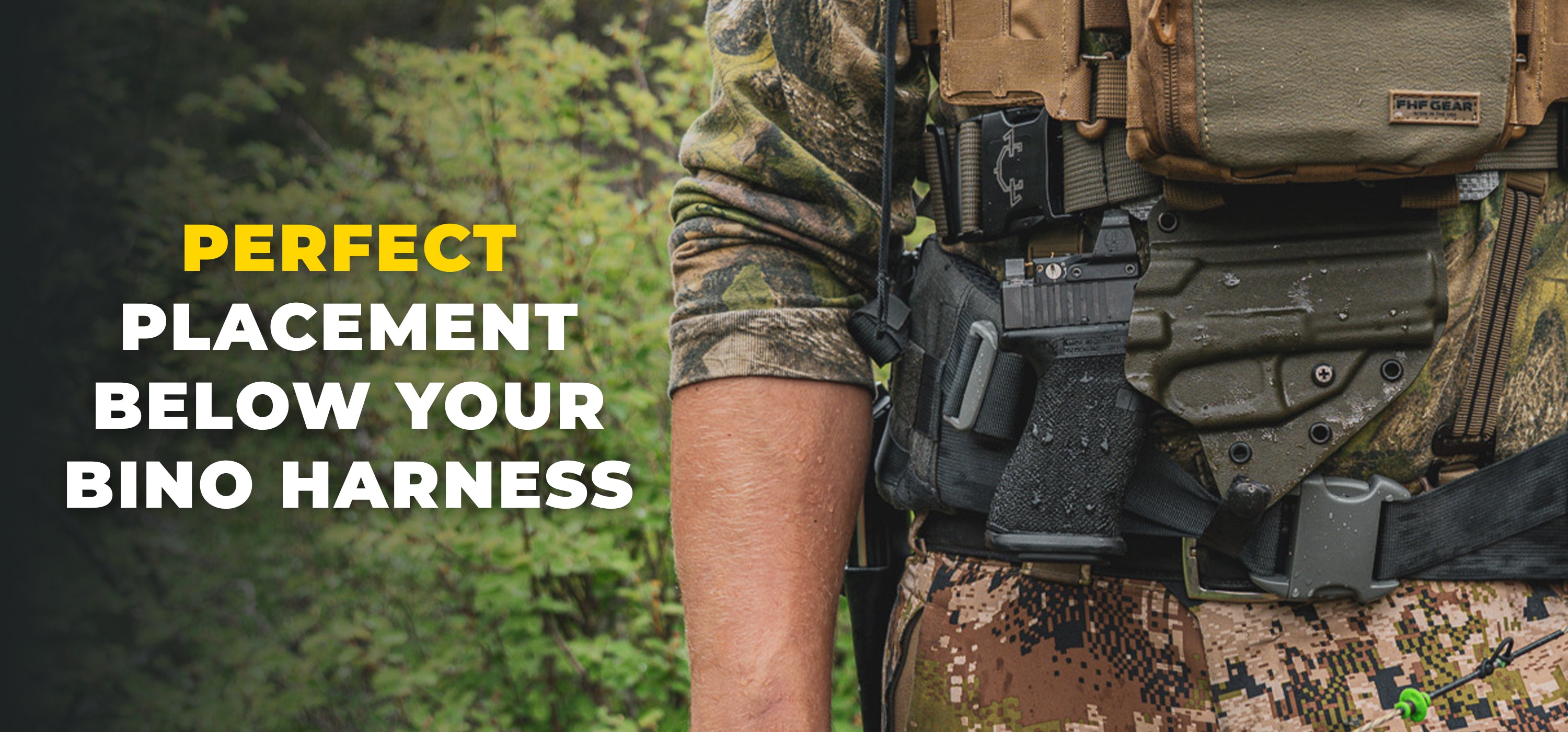 The Guide solves the age-old problem of bino harness holsters — keeping your sidearm exactly where you want it without being tethered to your harness. No more unclipping, re-rigging, or losing access to your firearm when you drop gear.