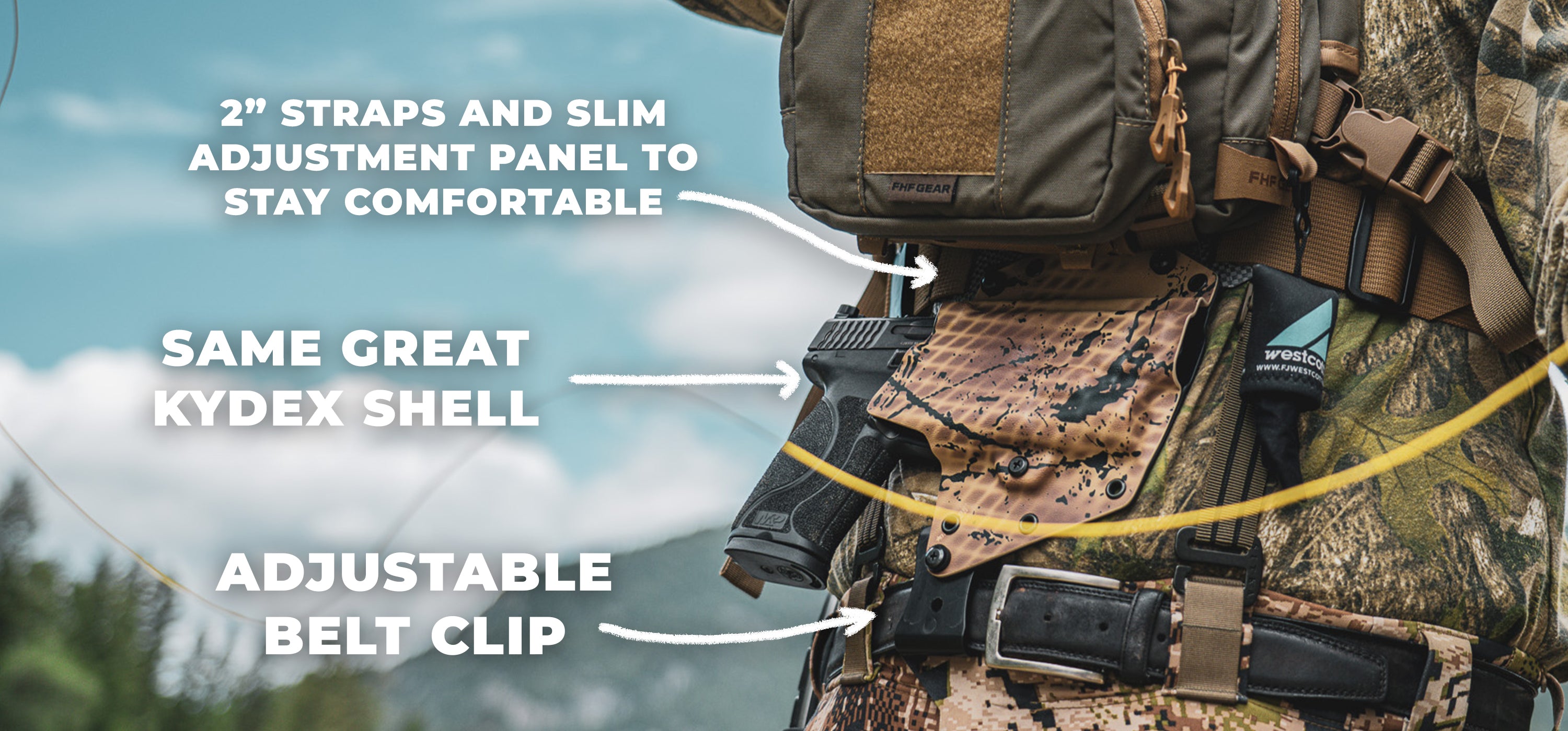 Built around a rugged Tegris upper panel, The Guide offers solid structure and holster adjustability, while wide 2" straps ensure all-day comfort and weight distribution you’ll barely notice. An integrated lower clip attaches to your belt or backpack hip belt for extra security on the move so your gun doesn’t flop around.